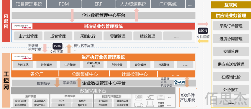 通过统一技术架构建立多网协同业务下的统一数据标准、安全数据传输机制、业务流程规范。分别在内部网建设【制造链业务管理系统】、在工控网建设【生产执行业务管理系统】、在互联网建设【供应链业务管理系统】支撑全业务环节的信息互通,全流程工艺实现和全过程数据汇集,提高生产流连续性和响应效率。