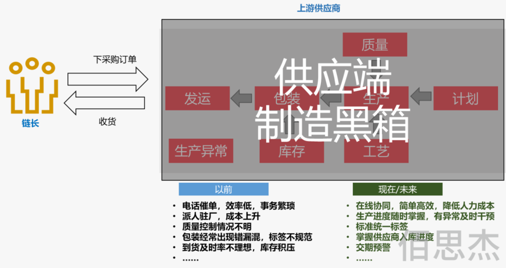 痛点3:人工反馈,开会协调 不同车间、产线、工序的作业进度主要依赖人工问询、周例会等形式进行反馈,此种方式的反馈规范程度和严谨性都无法达到实时性的要求,并且在反馈过程中时常有遗漏、推迟反馈以及准确度不高等问题出现,有些工艺流程需要跨车间、跨产线流转,有些部组件装配需要及时跟踪配套的零件加工进度、供应商生产进度,提前进行作业计划排产与调整,目前都较难支撑,如下图。