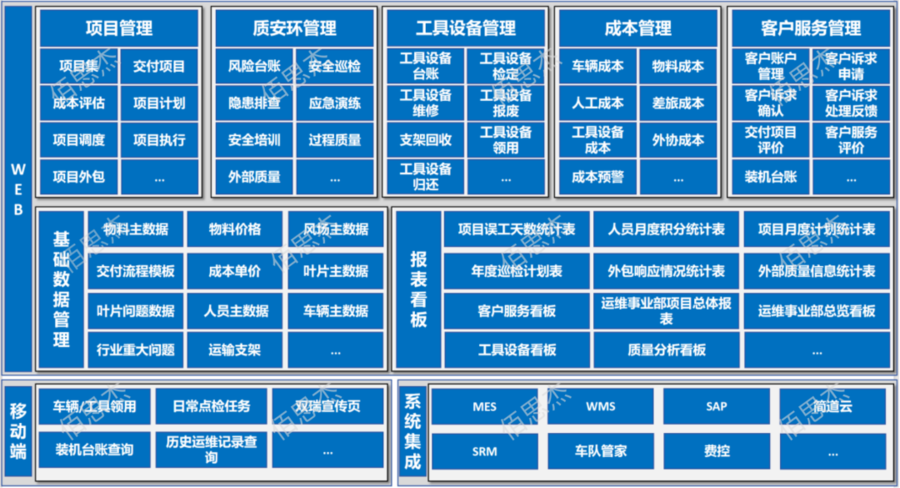 基于上述各个核心业务的诸多业务痛点,佰思杰与双瑞风电运维事业部以及信息化部门共同协作,将各个核心业务进行解耦与模块划分,整个系统分为五大模块:项目管理、质安环管理、工具设备管理、客户服务管理以及成本管理。以下是OMS系统总体设计蓝图: